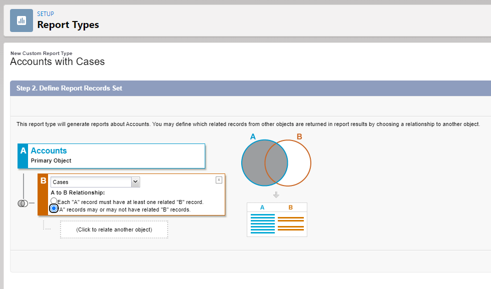 To do this Salesforce provides the ability to select a Report Type and you can even create your own custom report types seen below:
