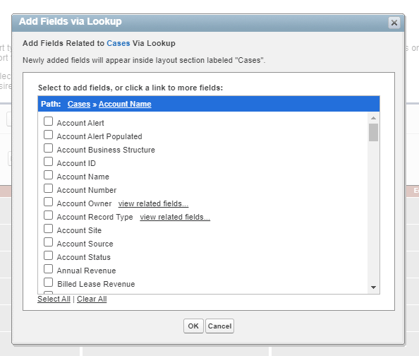 Select the Related Object : In the example below we chose the cases report type > Account Lookup. Notice all the fields we can now bring into this report by selecting the checkbox as needed.